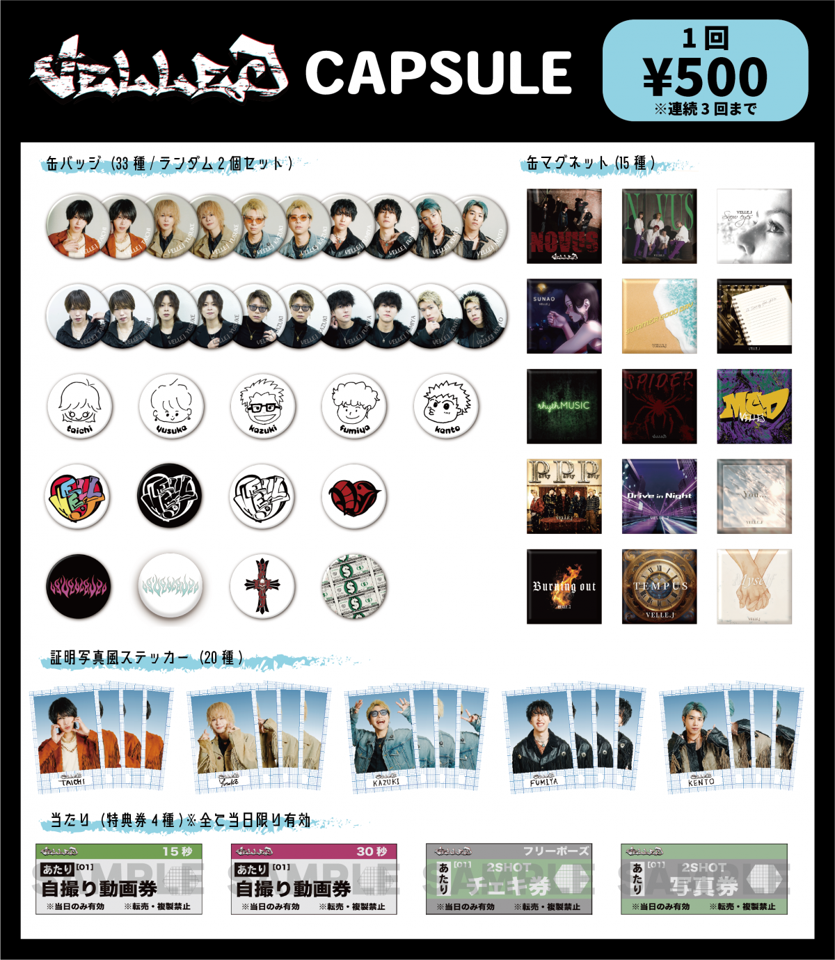 各撮影券類・グッズ・ガチャを販売します。詳しい販売物は別途物販フライヤーをご確認ください。動画券はガチャの当たりのみに入っています。グッズ6,000円購入による販売はございません。